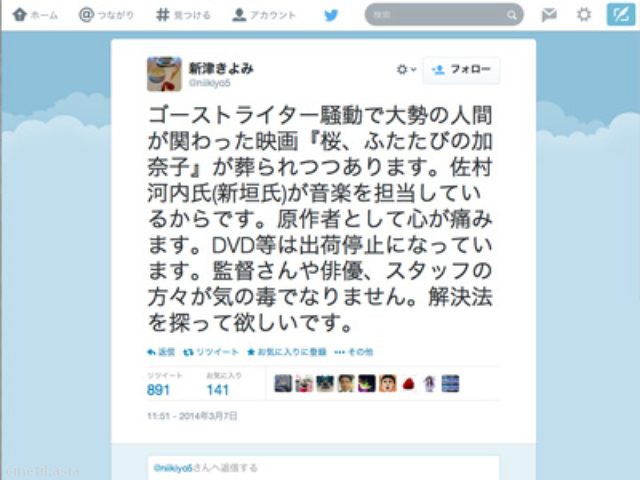 DVDが出荷停止…佐村河内氏作曲映画、原作者が悲痛の訴え「解決法を探って欲しい」ゴーストライター問題で話題の佐村河内守氏が音楽を担当した映画『桜、ふたたびの加奈子』の原作者・新津きよみさんが7日、同作のDVD・ブルーレイが出荷停止になっていることに触れて「解決法を探って欲しいです」とツイッターで呼び掛けた。詳細は下記までチェックイン![シネマトゥディ]http://www.cinematoday.jp/page/N0061247