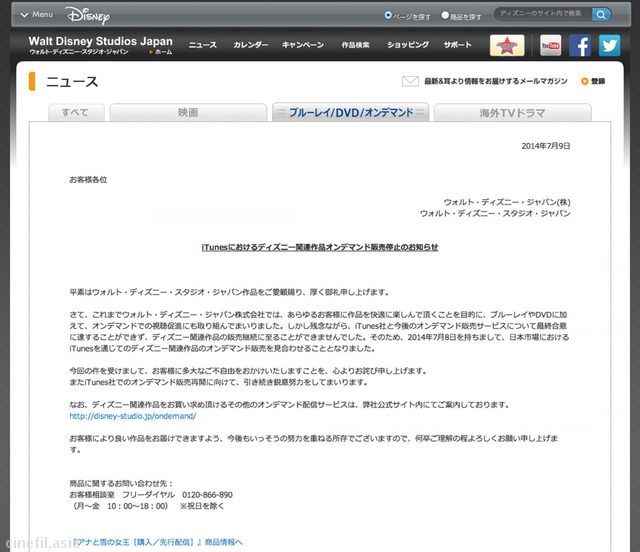 ウォルト・ディズニー・スタジオ・ジャパンが今月8日をもって、iTunesにおけるディズニー関連作品のオンデマンド販売を停止したことが明らかになった。9日、同社が発表した。詳細は下記までチェックイン![シネマトゥデイ]http://www.cinematoday.jp/page/N0064489