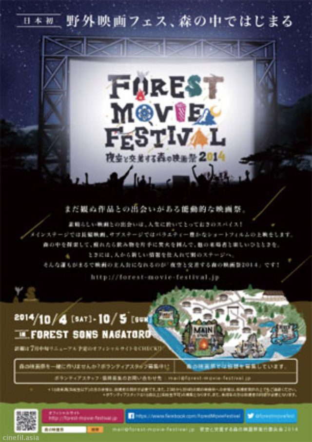 この度、埼玉県のフォレストサンズ長瀞キャンプ場にて、野外映画フェス「夜空と交差する森の映画祭 2014」を 2014 年10 月 4 日(土)にオールナイトで開催することが決定致しました。当イベントでは、長編映画・ショートフィルムを複数ステージにてフェス形式でオールナイト上映し、五感で"体感"することの面白さを伝えると同時に、映画文化の発展を目指すべく今年初めて開催いたします。詳細は下記までチェックイン![CINEMA TOPICS ONLINE]http://www.cinematopics.com/cinema/news/output.php?news_seq=21115