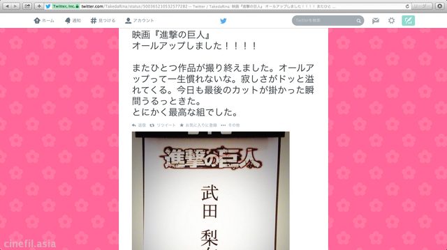 2015年公開予定の『進撃の巨人』。武田梨奈が、Twitterで撮影終了を報告!話題の映画だけに、興味津々…。軍艦島で撮影などの噂が飛び交うものの、配役が謎のままの実写版『進撃の巨人』は、三浦春馬が主演を務め、樋口真嗣監督がメガホンを取っている。そのほかの出演者として長谷川博己、水原希子、本郷奏多、三浦貴大、桜庭ななみ、松尾諭、石原さとみ、ピエール瀧など…。