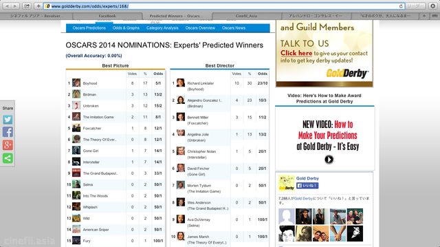 goldderbyでは、2015年オスカーの予想オッズがスタート。現在のところ、リチャード・リンクレイターとアレハンドロ・ゴンサレス・イニャリトゥ両監督が人気が高いが、年末に向けて、オスカー狙う作品が続々と公開されていくので、目が離せない。また、女優として評価も高いアンジェリーナ・ジョリーも監督としても賞レースに食い込むか!?評判も高い。その他、デヴィッド・フィンチャー、クリストファー・ノーラン、ウェス・アンダーソン監督など…。詳細は下記よりチェックイン![Gold Derby]http://www.goldderby.com/odds/experts/168/