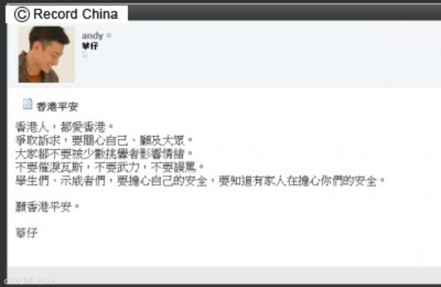 2014年10月4日、香港で続く民主派のデモについて、俳優アンディ・ラウ(劉徳華)が公式サイトで再びメッセージを発表。前日に起こった衝突騒動に心を痛め、暴力行為への反対を訴えた。東森新聞網が伝えた。 詳細は下記よりチェックイン![レコードチャイナ]http://www.cinematoday.jp/page/N0066890